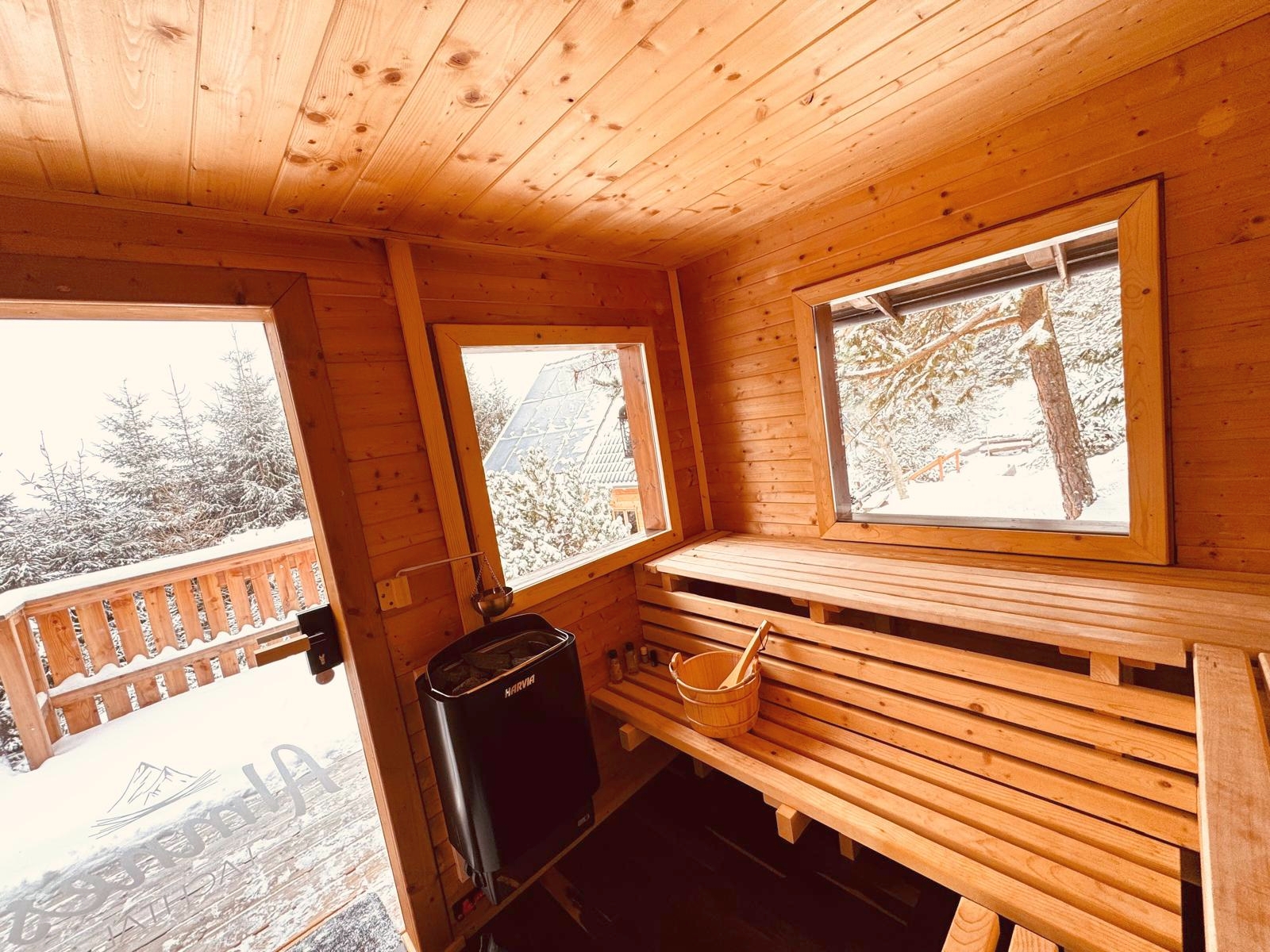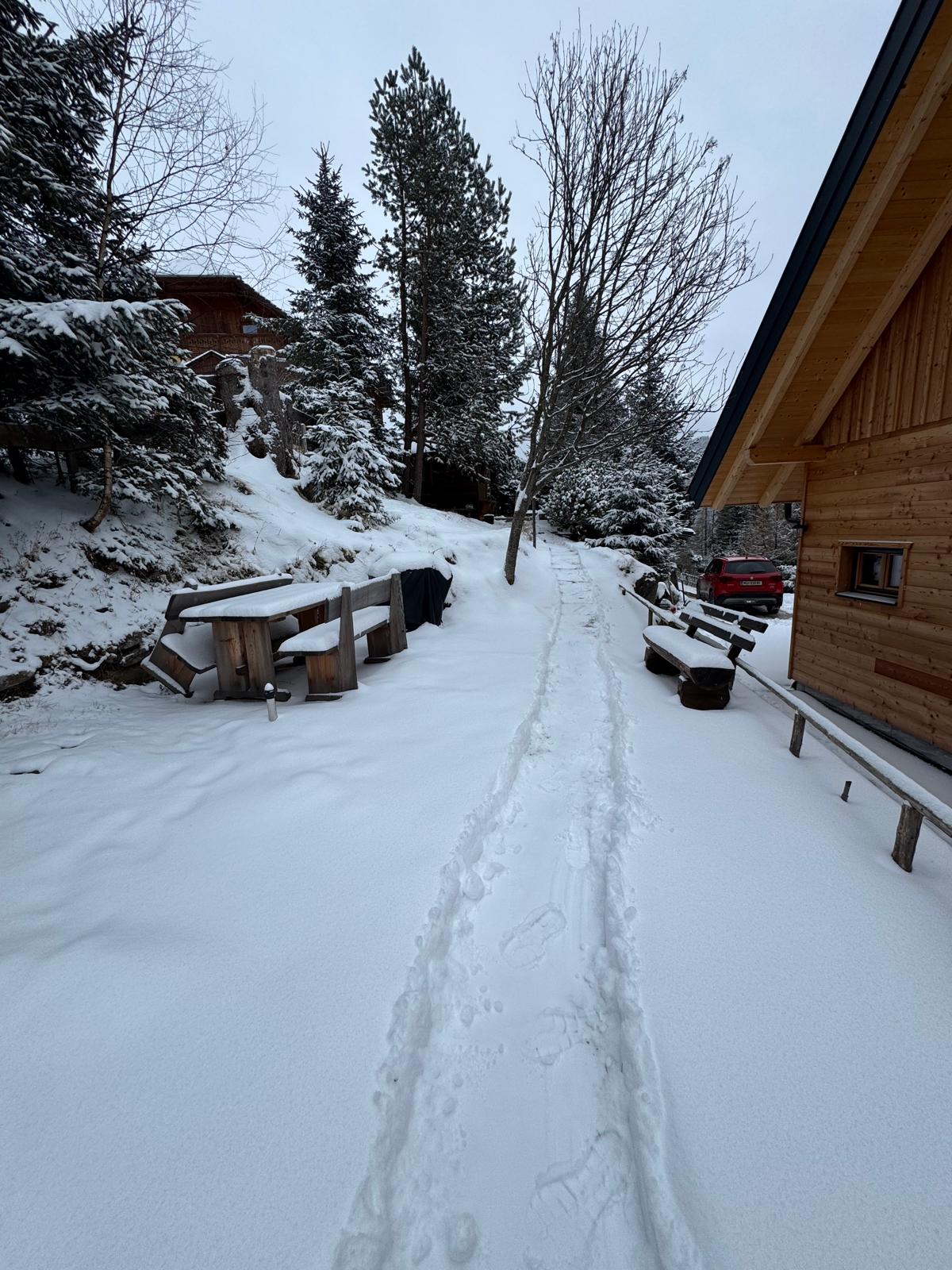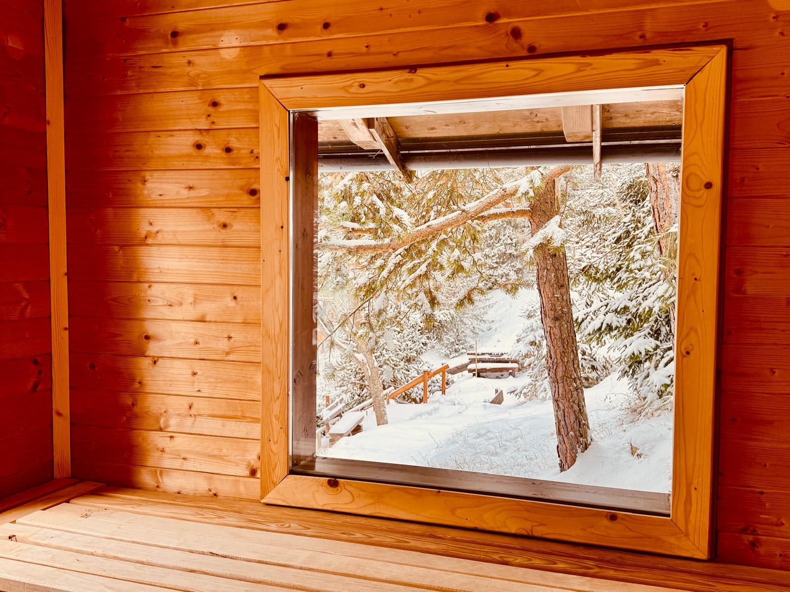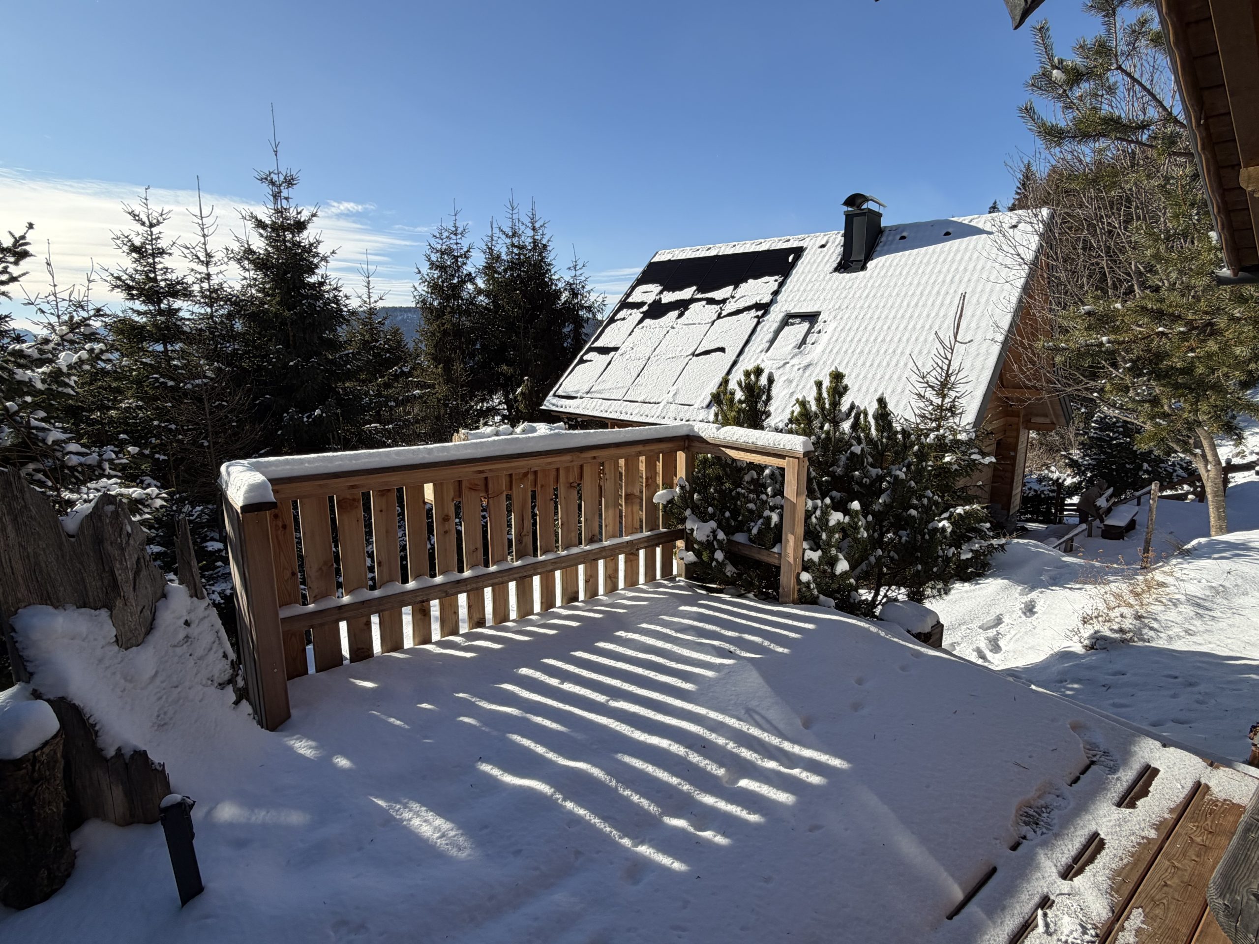 Der Balkon mit der überdachten Winterlounge ist ein gemütliches Plätzchen um bei einer Tasse Tee das Winterparadies zu genießen.